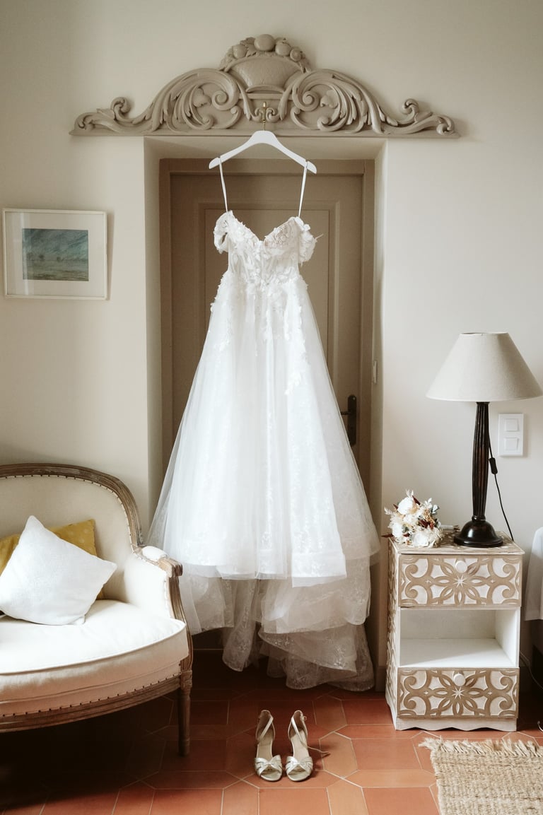 Autre point important : choisissez une pièce suffisamment spacieuse pour mettre en valeur votre robe et pour accueillir vos témoins et membres de la famille. Cela permettra également au photographe d'avoir suffisamment de recul pour prendre différents angles.